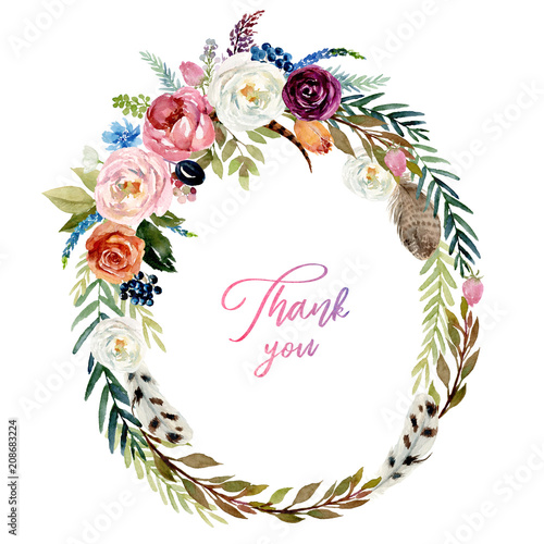 Watercolor Floral Boho Illustration Wreath With Colorful Green Leaves Feather Vivid Flowers For Wedding Stationary Greetings Wallpapers Fashion Backgrounds Textures Diy Wrappers Cards Buy This Stock Illustration And Explore