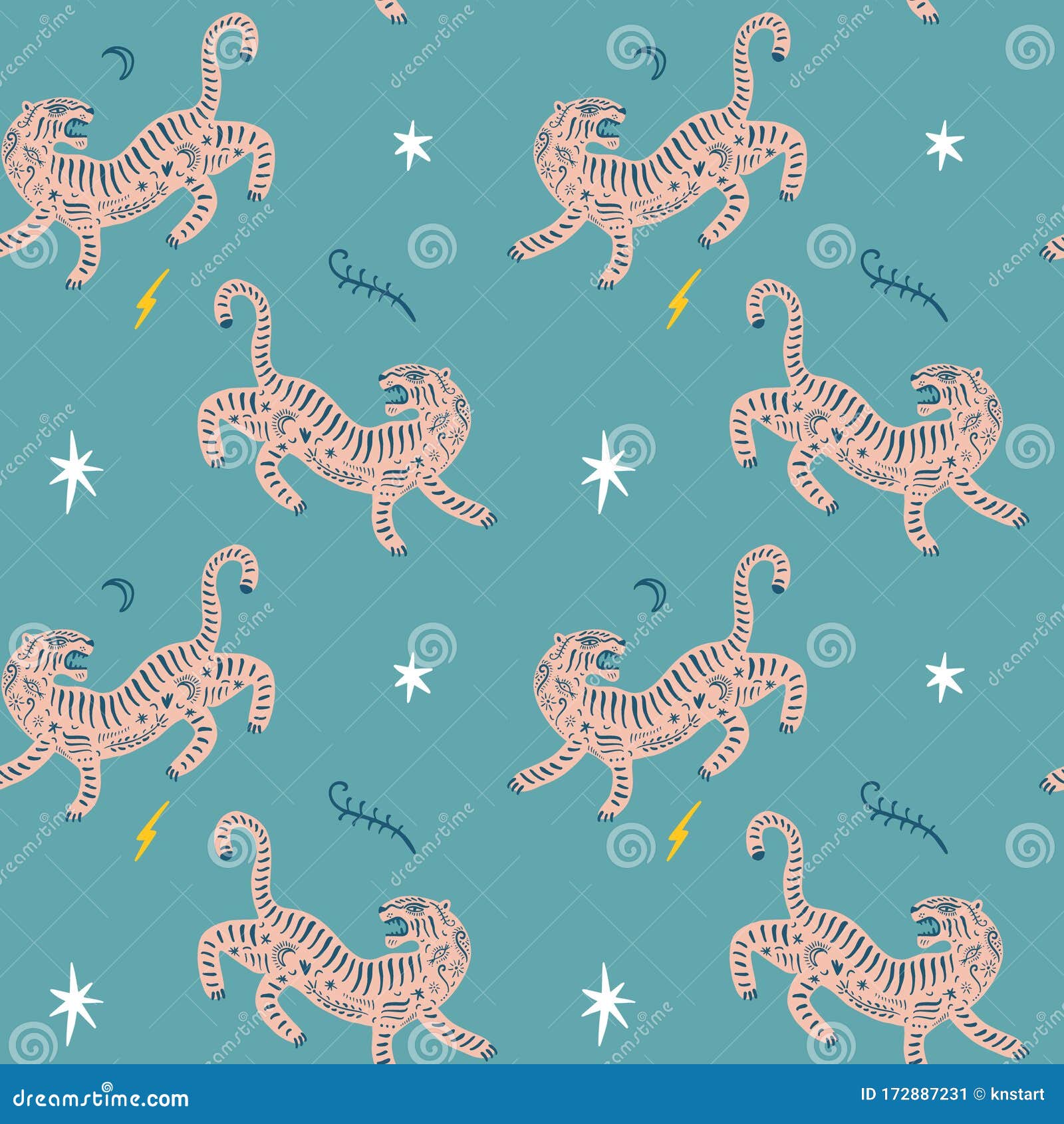 Vector Doodle Seamless Pastel Pattern With Cute Tigers Tropical Cats Background Boho Wallpaper Stock Illustration Illustration Of Happy Funny 172887231